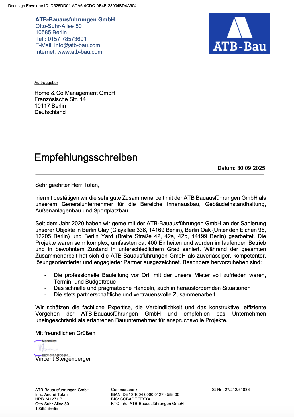 Auswahl an Empfehlungsschreiben unserer Auftraggeber.